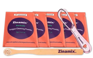 Zinamix is a unique tongue-cleaning powder developed to effectively remove tongue coating, the main source of bad breath. Unlike traditional methods, Zinamix targets the root cause of oral odor, promoting fresh breath and a healthier mouth. It was invented to solve the limitations of mouthwashes and mechanical tongue scrapers, which often fail to fully eliminate the odor-causing coating.